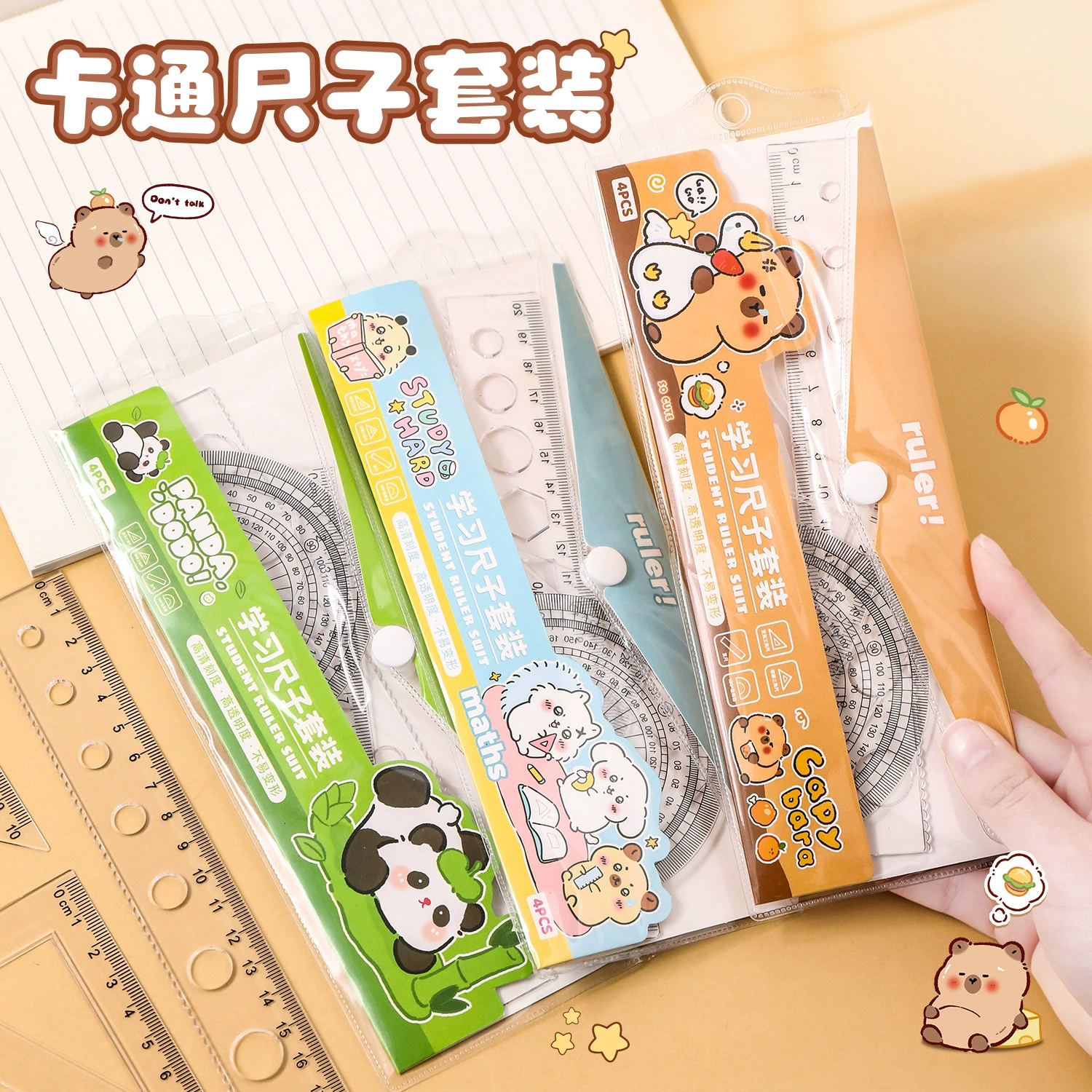 卡皮巴拉尺子套装小学生可爱套尺卡通儿童直尺三角板量角器四件套
